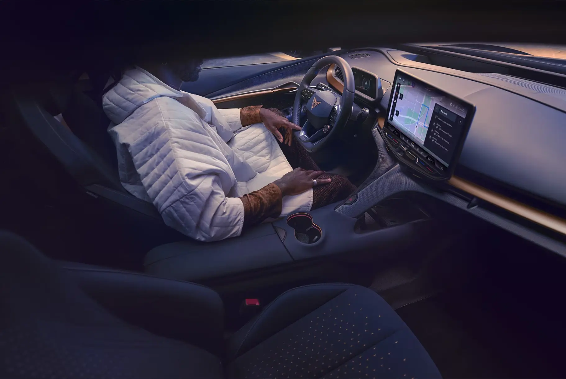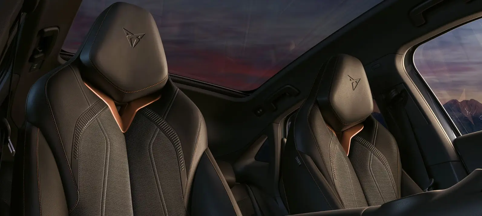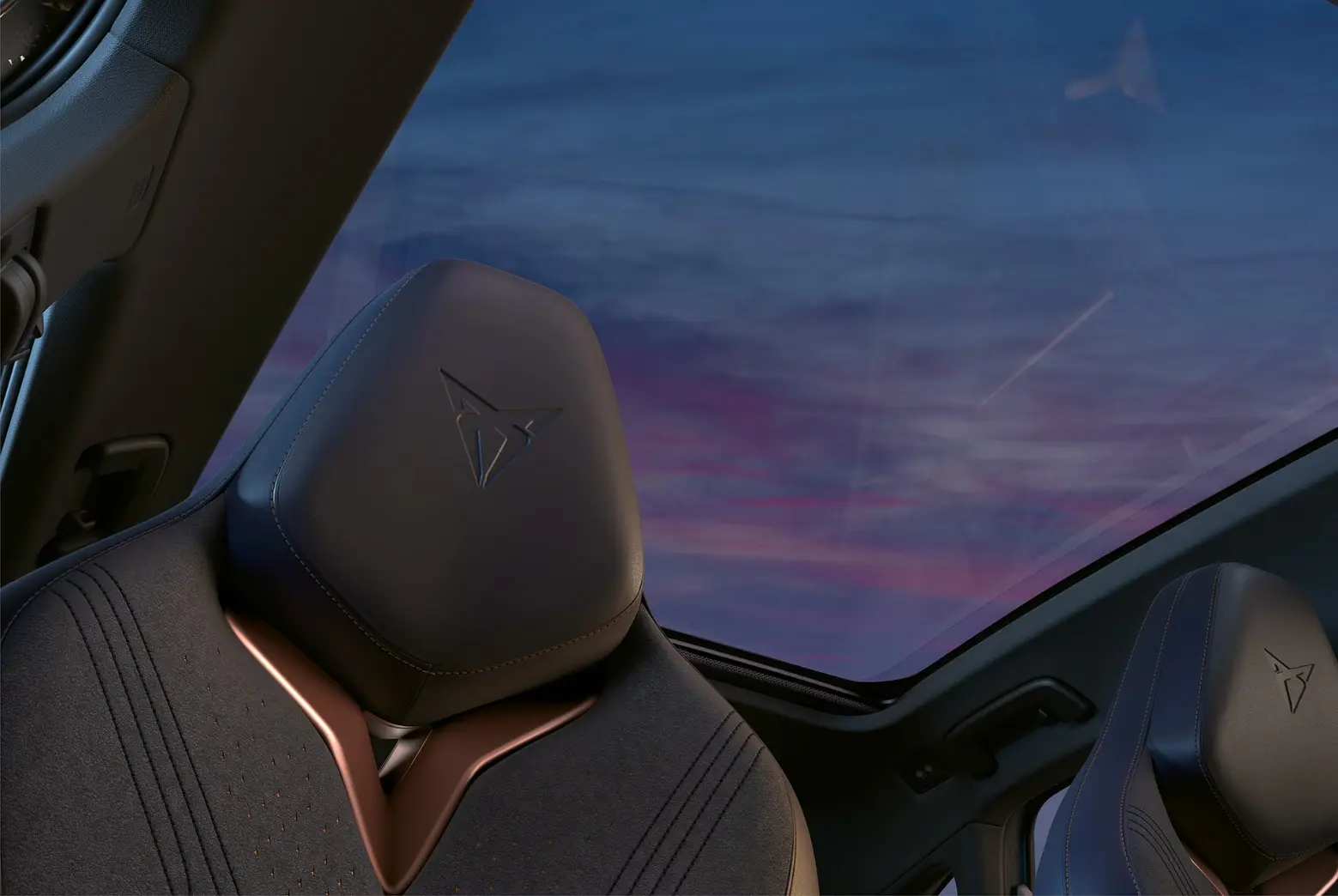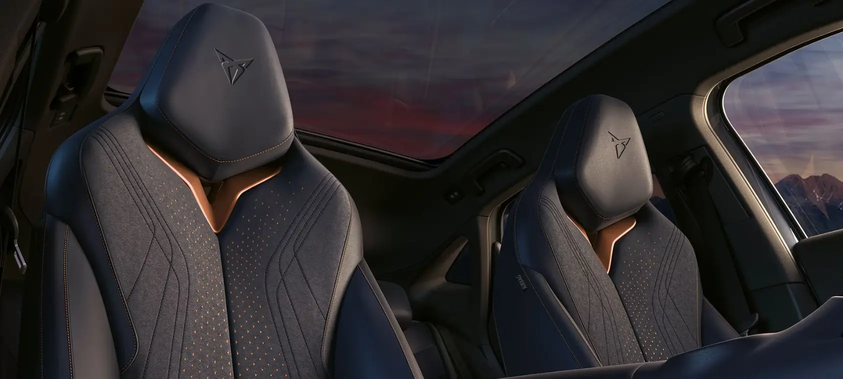 Sportowy charakter wnętrza definiują ergonomiczne fotele kubełkowe. Ich dynamiczne linie podkreślone są charakterystycznymi miedzianymi akcentami, a całość pokrywa innowacyjna tapicerka, wykonana w 50% z mikrofibry Contrast pochodzącej z recyklingu.